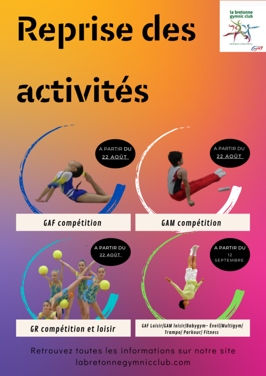 Les activités redémarrent à La Bretonne avec les stages de reprise pour les GAF GAM compétition, pour les GR compétition et loisir à partir du 22 août. Retrouvez les dates et horaires pour chaque groupe dans l'onglet "stage".